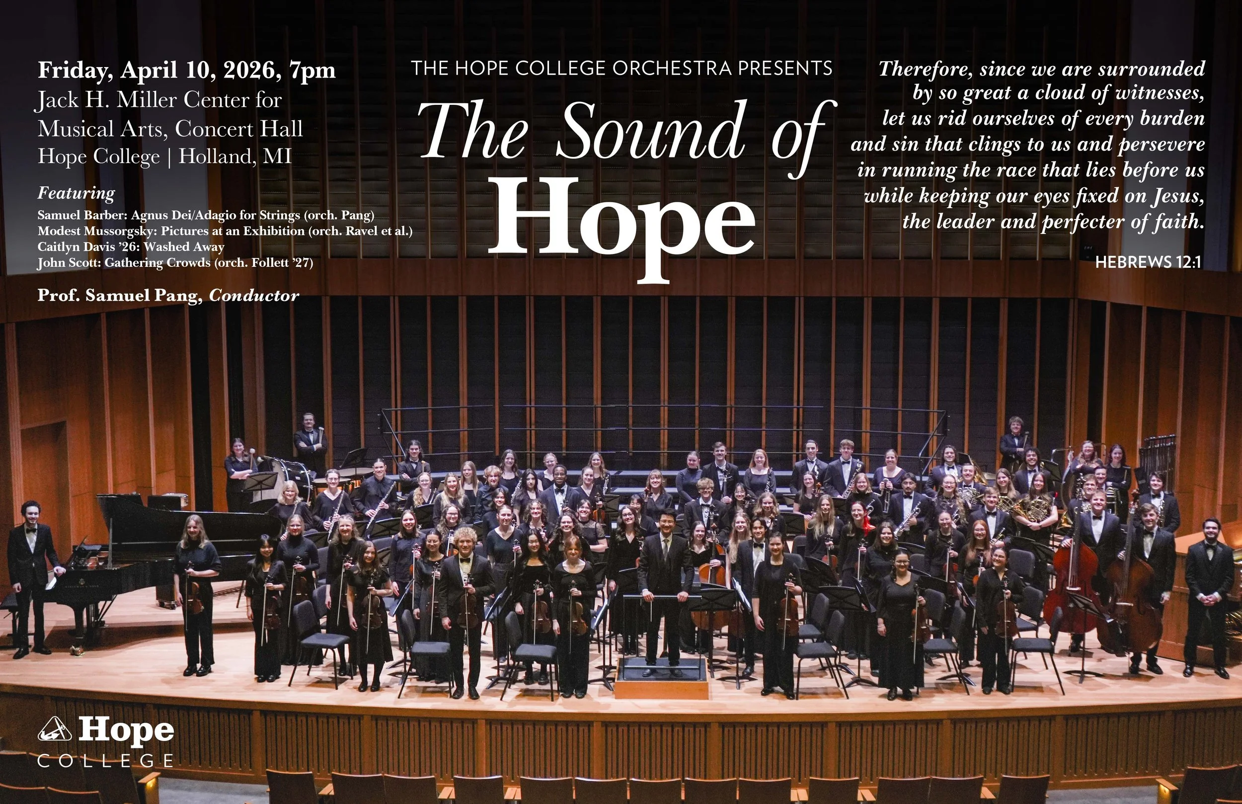The Hope College Orchestra, based in Holland, Michigan, is Hope’s premier audition-based instrumental ensemble, open to students of all academic disciplines. The diverse backgrounds and talents of the orchestra members are celebrated through the fostering of interdisciplinary conversations within the course structure and concert programming. The ensemble is led by the Orchestra Board, which consists of nine elected representatives and orchestra director, Samuel Pang. The orchestra has been blessed with significant growth in recent years, and is presently comprised of over 80 musicians. The Hope College Orchestra anchors itself in J.S. Bach’s belief that “the aim and final end of all music should be none other than the glory of God and the refreshment of the soul.” Hence, musical excellence as an act of worship is central to the purpose of the orchestra. Through their concert programs such as “The Symphonic Story of Hope,” “The Symphonic Story of Scripture,” and “The Symphonic Story of Home,” the orchestra seeks to share a story that extends beyond mere music making, one that deeply impacts their audience. Concert repertoire that represents the sins of humankind, God’s salvation, and Christ’s death and resurrection, paired with a deep passion to worship God through music, results in an orchestra that creates music for a purpose greater than themselves. The orchestra was awarded the honor to perform as a featured Showcase Ensemble at the world-renowned Carnegie Hall in New York City as part of the 2025 New York International Music Festival, providing the ensemble with an opportunity to share their “Symphonic Story of Hope” with those from all around the United States. Though a monumental achievement for the ensemble, the Carnegie Hall Tour was just the beginning of the Hope College Orchestra’s success and legacy — the ensemble strives to continue to share its music, worship, and stories with an even greater audience. In January 2025, the orchestra lost one of its own, violinist Jennifer Kasunick. In the wake of her passing, the ensemble found renewed purpose in using music to honor the lives and memories of loved ones, carrying their stories forward through every performance.